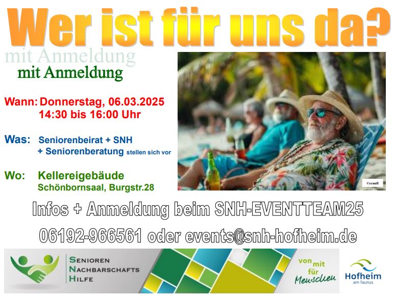 Älter werden wir alle. Aber wer ist dann für uns da? Die Seniorenberatung, Seniorenbeirat und SNH sind die Player in Hofheim im Bereich der Arbeit mit älteren Menschen. Sie stellen gemeinsam ihre Arbeit vor