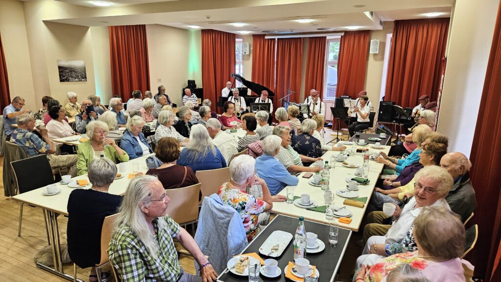 Am Donnerstagnachmittag, dem 5. Juni 2025, lud die SeniorenNachbarschaftsHilfe e.V. Hofheim (SNH) zu einem musikalischen Pfingstauftakt unter dem Motto „Let’s swing to Pfingsten“ ein. Über vierzig Gäste folgten der Einladung und erlebten einen beschwingten Nachmittag mit der beliebten Altmünster Schellack Band, die mit ihrem nostalgischen Sound für beste Stimmung sorgte. Teil der Band mit ihrer Trompete ist die SNH-Vorsitzenden Monika Thorhauer, die für das gelungene Konzert wöchentlich in der Altmünstermühle in Hattersheim probte. Neben ihrem musikalischer Beitrag wurde ihr unermüdliches Engagement in der Vorstandsarbeit der SNH mit einem extra Applaus gewürdigt. Auch das ehrenamtliche Helferinnenteam der SNH trug wieder wesentlich zum Gelingen des Nachmittags bei. Mit großer Herzlichkeit sorgten die Helferinnen und Helfer für eine liebevolle Bewirtung mit Kaffee und Kuchen. Die Gäste zeigten sich rundum zufrieden und dankten nach anderthalb Wohlfühlstunden der Band und dem Team mit viel Beifall. Allen war förmlich anzusehen, dass die musikalischen Rhythmen die Gemüter in harmonische Schwingungen versetzten. Beim Nachhause gehen gab es dann auch viel Lob, Danksagungen und Spenden, welche der Altmünster Schellack Band und der SNH zugutekommen. Es war wieder einer der gelungenen Veranstaltungen der SNH, wo gesellschaftliche Teilhabe erlebbar wird, Menschen zusammen kommen und in der Gemeinsamkeit Spaß haben.