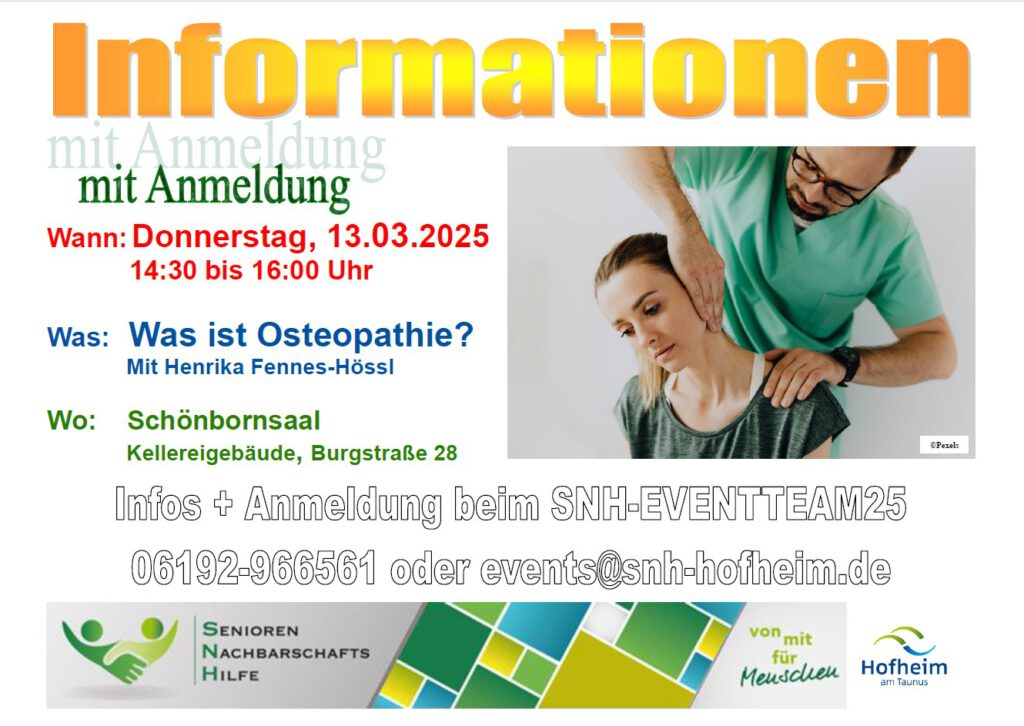 Die SeniorenNachbarschaftsHilfe e.V. Hofheim (SNH) lädt alle Interessierten herzlich zu einem informativen Vortrag über Osteopathie ein.